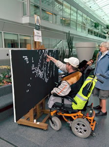Les personnes réalisent cette oeuvre artistique par petites touches en apposant leurs empreintes digitales sur une toile suivant une trame prédéfinie.