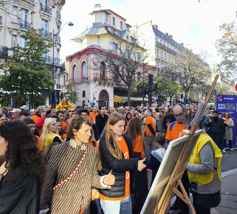 En fin de parcours, au Village de la Fraternité, sur le parvis de l’Hôtel de Ville de Paris, était exposée l’œuvre « 13 novembre, Résiliences... », réalisée neuf ans plus tôt par les victimes, leurs proches et les habitants des quartiers endeuillés.