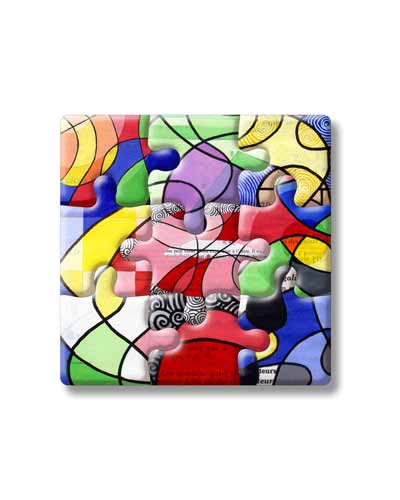 Une des premières phases d’évolution est apparue, en utilisant la forme de puzzle comme nuance. Il apparut une forte similitude entre " les Demoiselles " et le puzzle, de part la courbe et le découpage des pièces.