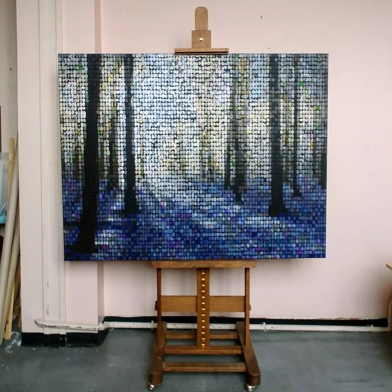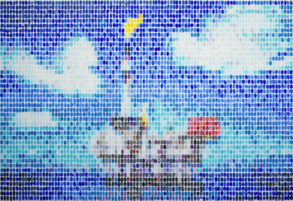 Chaque Å“uvre est réalisé avec l’aide d’un public qui est invité a apposé sur les directives de l’artiste leur empreinte digital avec de la peinture.