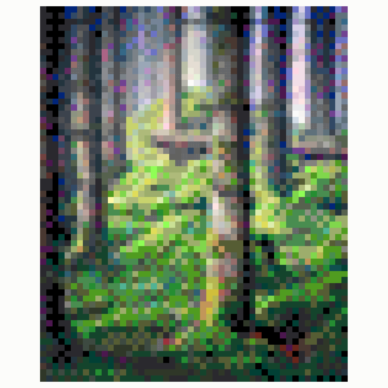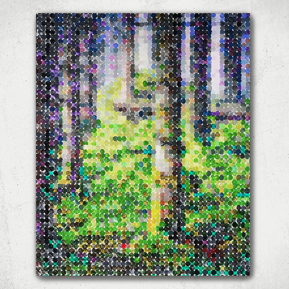 Dans le virtuel le sujet de l’œuvre est respecter, les couleurs aussi, mais elle est dans sa « propreté » du pixel ou chaque carrée est parfait et d’une seul couleur.